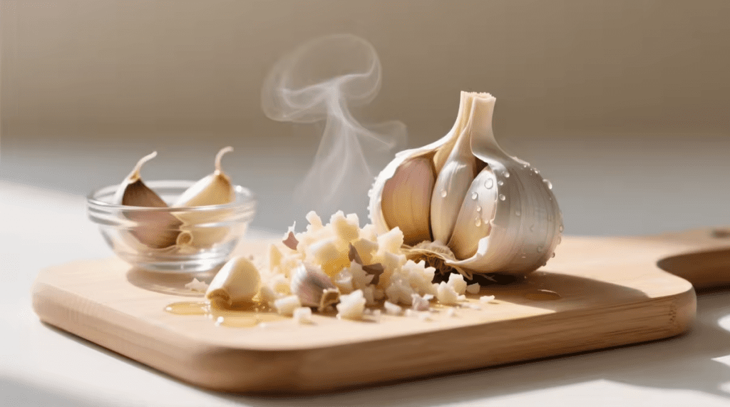 Cuando lo picas o machacas, las células se rompen y comienza una reacción química natural. Es ahí donde se forma la alicina, un compuesto azufrado responsable del aroma intenso y de muchos de los beneficios asociados al ajo.