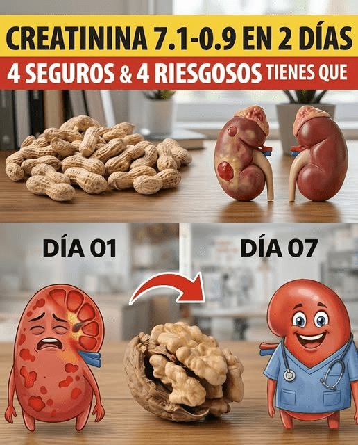 No existe evidencia científica que indique una reducción rápida como “de 7 a 0.9 en dos días”. Sin embargo, las nueces y grasas saludables pueden apoyar la función renal a largo plazo y mejorar la salud cardiovascular.