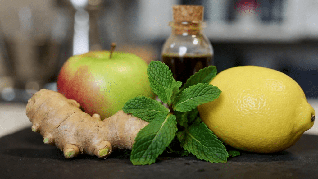 - Reúne los ingredientes: Toma 1 cm de jengibre fresco, jugo de 2 limones, un puñado de hojas de menta (alrededor de 10-15), 1 manzana verde mediana y 5-10 gotas de extracto hepático natural (disponible en farmacias o tiendas naturistas).