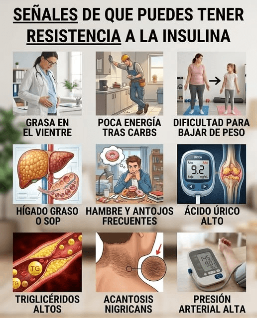 Las señales relacionadas con la resistencia a la insulina pueden aparecer de forma silenciosa durante años. Grasa abdominal, cansancio después de comer, hambre frecuente o cambios en la piel pueden ser pistas que el cuerpo envía para llamar la atención.